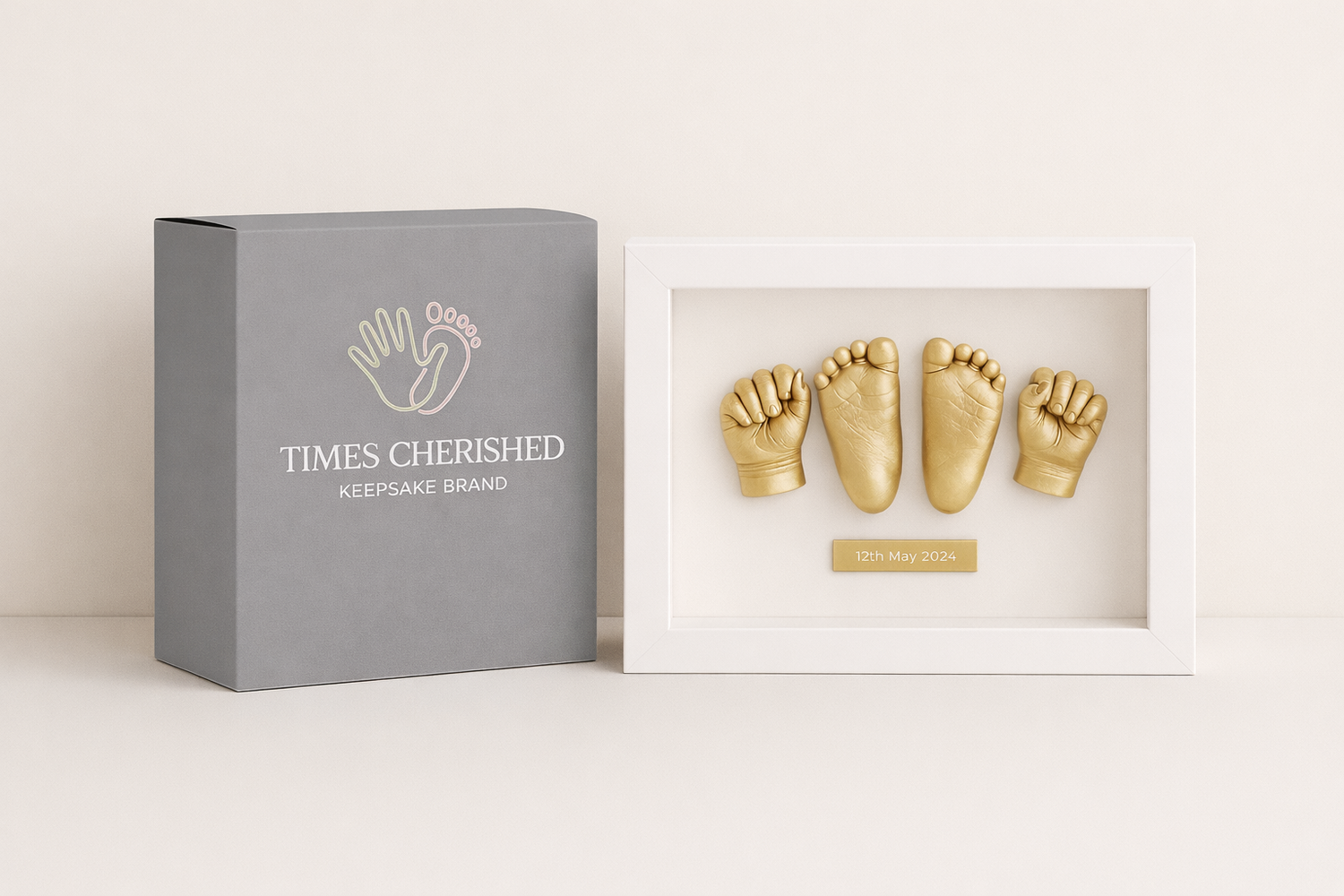 Each kit includes everything you need to create your keepsake: molding powder, casting material, stirring stick, step-by-step instructions, a custom-fit white frame, and a personalized plaque — all beautifully packaged and ready to gift.